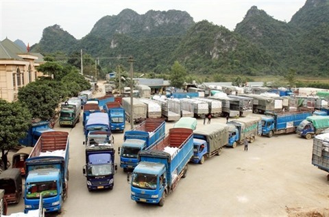 | Des camions transportant des marchandises en Chine en attendant le dédouanement avant de traverser le poste-frontière de Na Nua dans le district de Trang Dinh, province septentrionale de Lang Son. |