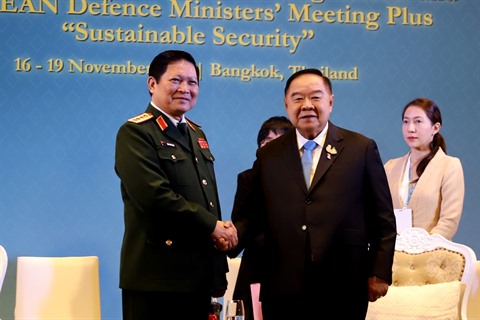 | Le membre du Bureau politique, secrétaire adjoint de la Commission militaire centrale et ministre de la Défense, Ngô Xuân Lich (gauche), et le vice-Premier ministre thaïlandais Prawit Wongsuwan, le 18 novembre à Bangkok. |