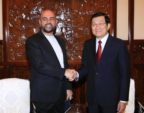 | Le président de la République, Truong Tân Sang (à droite), et l’ambassadeur iranien Hossein Alvandi Behineh. |