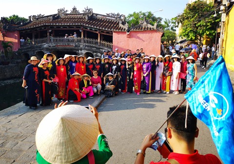 | Les touristes devant le Pont-pagode (Chùa Cầu) à la vieille ville de Hôi An, province de Quang Nam (Centre). |