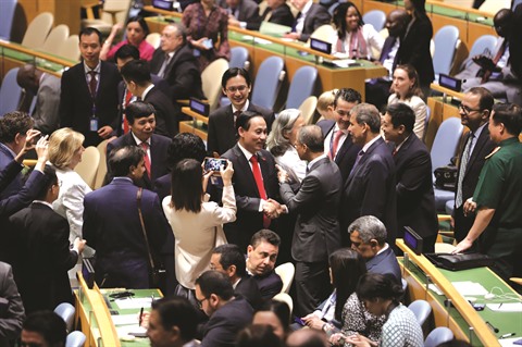 | Lê Hoài Trung (cravate rouge, au centre), vice-ministre des Affaires étrangères et chef de la délégation vietnamienne auprès de l’ONU, reçoit des félicitations des pays membres après l’élection, le 7 juin à New York. |