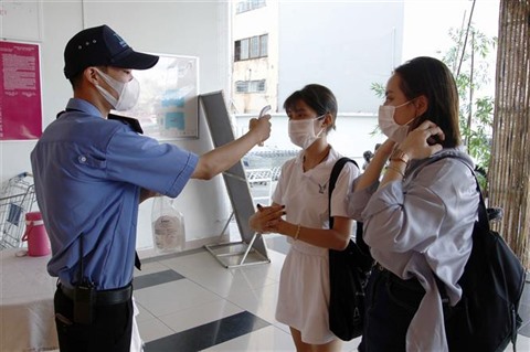 | Mesure de la température corporelle des clients au supermarché Co.opmart à Cà Mau (Sud), le 1er mai. Photo : Kim Ha/VNA/CVN |