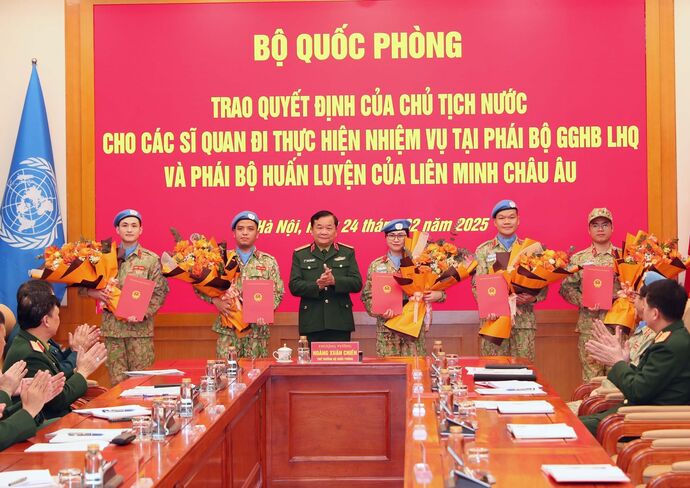 Il a souligné qu'il s'agissait d'un grand honneur, mais aussi d'une grande responsabilité, et a exhorté ces officiers à maintenir leur fermeté politique, leur exemple moral, leur esprit d'unité et de responsabilité, et à mettre à profit leurs connaissances, leur expérience et leurs compétences pour accomplir leurs missions avec excellence, projetant une image positive du Vietnam à l'échelle internationale.