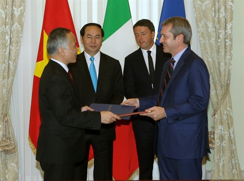 | Cérémonie de remise de documents de coopération, en présente de Trân Dai Quang (2e plan à gauche) et Matteo Renzi (2e plan à droite), le 23 novembre à Rome. |