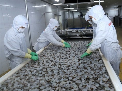 | Transformation des crevettes pour l'exportation dans une usine de la Compagnie par actions du groupe des produits aquatiques Minh Phu. |