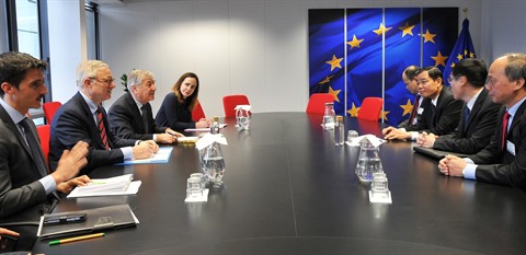 | Séance de travail entre le ministre Nguyên Xuân Cuong (droite) et le commissaire Karmenu Vella, le 22 mars à Bruxelles. |