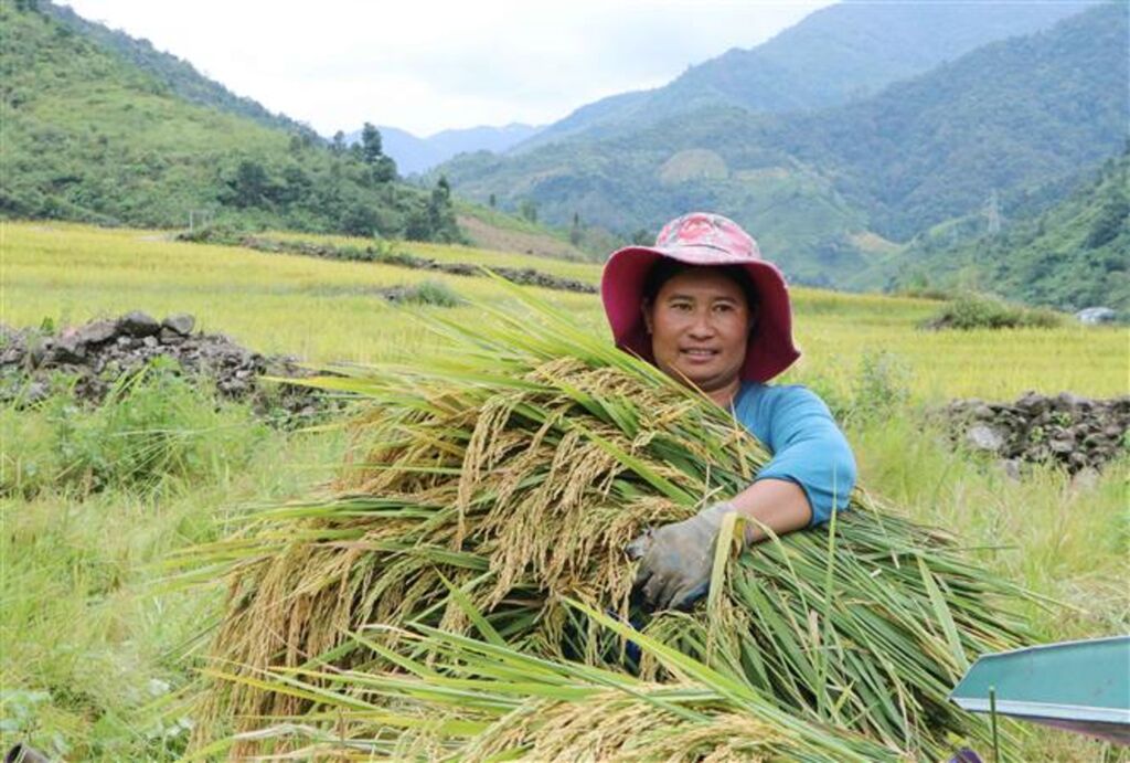 | Ly Mỳ Hu, domiciliée dans le village Seo Then, district de Muong Tè, province de Lai Châu (Nord), se réjouit de la bonne récolte du riz. |