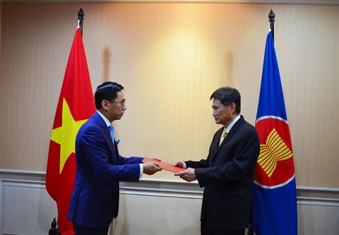 | L'ambassadeur Trân Duc Binh (gauche) présente ses lettres de créance au secrétaire général de l'ASEAN, Dato Lim Jock Hoi. |