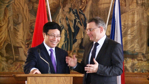 | Le vice-Premier ministre et ministre vietnamien des AE, Pham Binh Minh (gauche), et le ministre tchèque des AE, Lubomir Zaoralek, le 24 juillet à Prague. |
