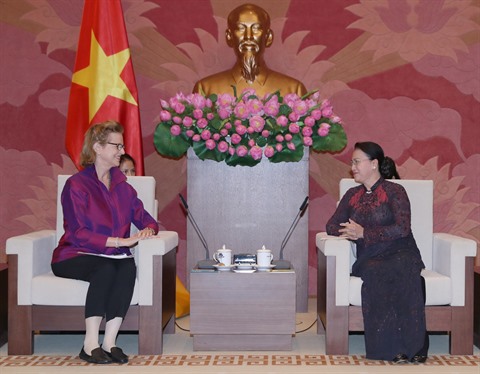 | La présidente de l’Assemblée nationale du Vietnam, Nguyên Thi Kim Ngân (droite), et la nouvelle directrice du PNUD au Vietnam, Caitlien Weisen, le 8 novembre à Hanoï. |