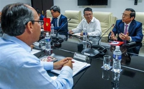 | Le chef adjoint de la Commission centrale de la propagande et de l'éducation du PCV, Lai Xuân Môn (droite), lors de son entretien avec Rogelio Polanco Fuentes, chef du Département idéologique du Comité central du PCC. |