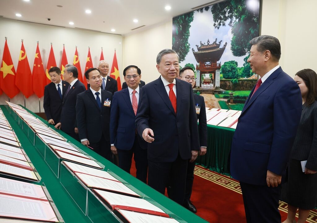| Le secrétaire général du Parti, Tô Lâm, et le secrétaire général du Parti et président chinois Xi Jinping assistent à la présentation des documents de coopération entre les deux pays. |