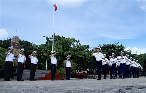 | Une cérémonie pour saluer le drapeau sur l’île de Truong Sa Dông de l’archipel vietnamien de Truong Sa. |