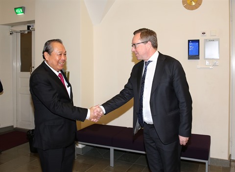 | Le vice-Premier ministre permanent Truong Hoà Binh (gauche) et le vice-Premier ministre par intérim et ministre des Finances de la Finlande, Mika Lintila, à Helsinki le 27 septembre. |