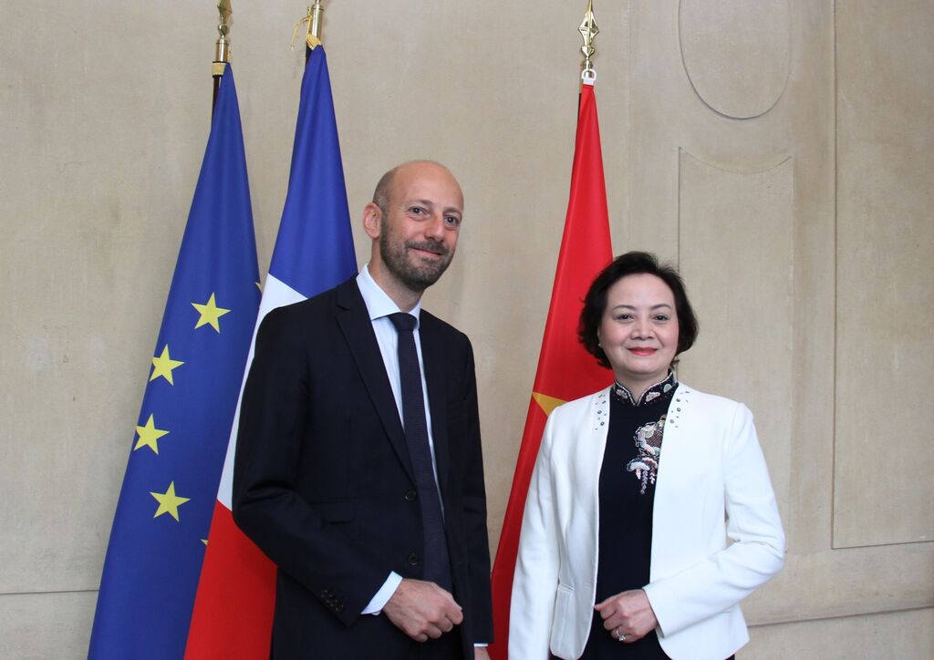 | Le ministre français de la Transformation et de la Fonction publiques, Stanislas Guerini, et la ministre vietnamienne de l'Intérieur Pham Thi Thanh Trà. |