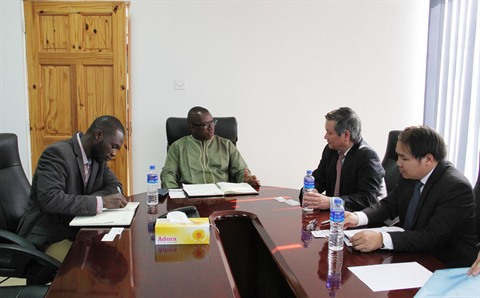 | L’ambassadeur du Vietnam en Gambie, Pham Quôc Tru (droite), a travaillé le 17 avril avec des représentants de la Chambre de commerce et d’industrie de la Gambie. |