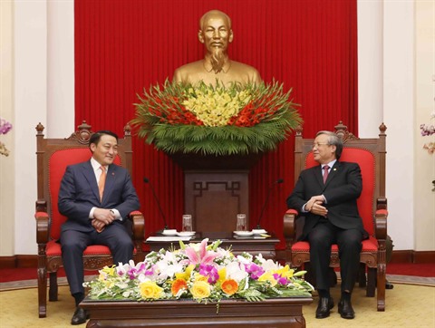 | Trân Quôc Vuong, membre du Politburo et permanent du Comité central du PC vietnamien (droite)et Dashzegve Amarbayasgala, secrétaire général du PPM, le 4 mars à Hanoï. |