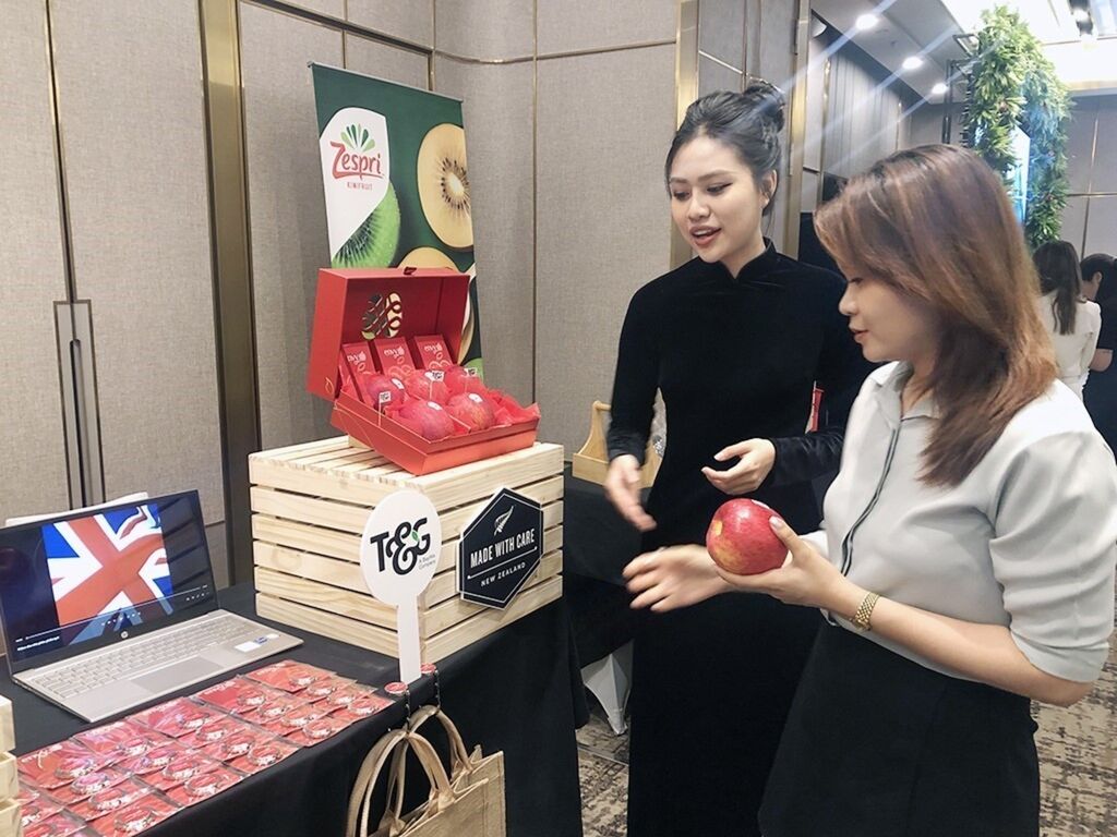 | Des fruits néo-zélandais sont exposées lors de la campagne de vente au détail "Made With Care", en juin 2023 à Hô Chi Minh-Ville. |