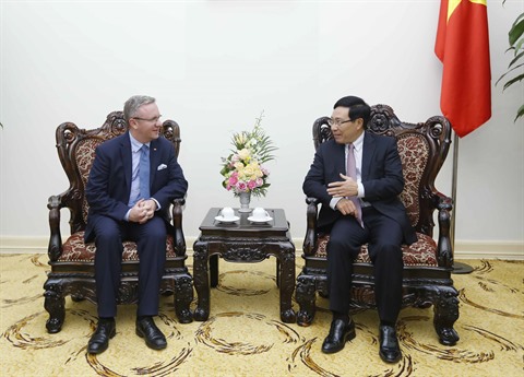 | Le vice-Premier ministre et ministre des Affaires étrangères Pham Binh Minh (droite) et le ministre chef du bureau présidentiel polonais Krzysztof Szczerski, le 16 décembre à Hanoï. |