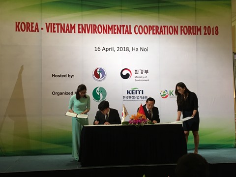 | Signature du mémorandum sur l'amélioration du système d'évacuation des eaux usées entre Hà Tinh et le KEITI de la R. de Corée, le 16 avril à Hanoï. |