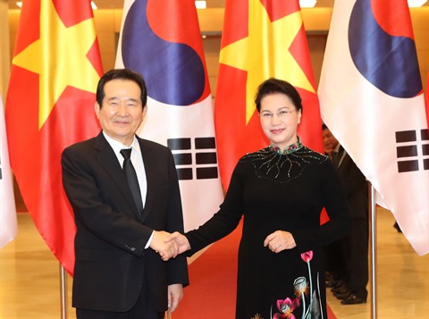 | La présidente de l’Assemblée nationale vietnamienne, Nguyên Thi Kim Ngân, et son homologue sud-coréen, Chung Sye-kyun |