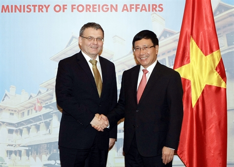 | Le vice-Premier ministre et ministre des Affaires étrangères Pham Binh Minh (droite) et le ministre tchèque des Affaires étrangères Lubomir Zaoralek, le 23 octobre à Hanoi. |