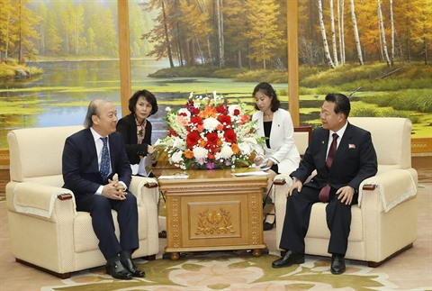 | Vo Van Phuông (gauche), vice-président de la Commission de sensibilisation et d’éducation du Comité central du PCV et le membre permanent du Bureau politique de la RPDC Choe Ryong-hae. Photo: Phuong Hoa/VNA/CVN |