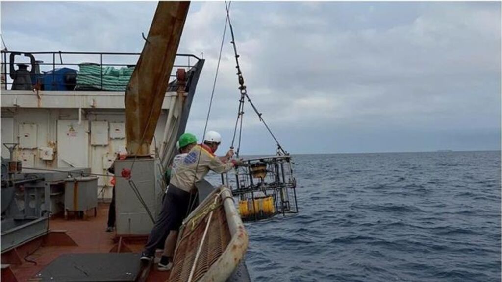 | Echantillonnage de sédiments dans la zone du plateau continental du Vietnam par l'équipe d'exploration. |