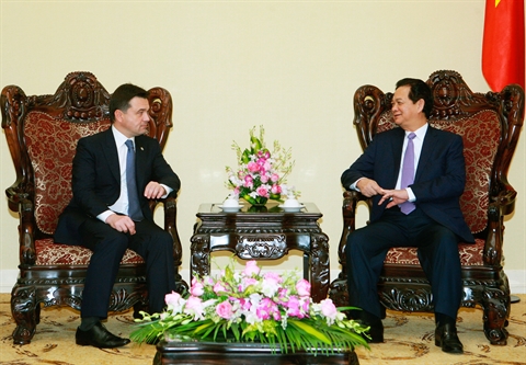 | Le PM vietnamien, Nguyên Tân Dung (à droite) reçoit le 22 octobre à Hanoi le gouverneur de la région de Moscou, Andrei Vorobyov. |