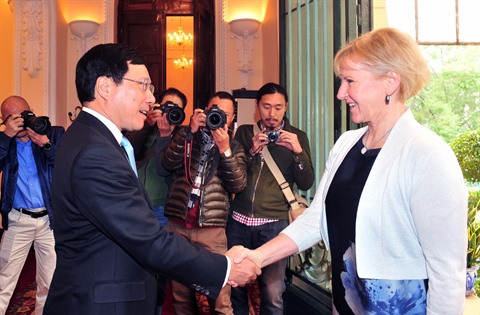 | Le vice-Premier ministre et ministre vietnamien des Affaires étrangères Pham Binh Minh et la ministre suédoise des Affaires étrangères Margot Wallström. |
