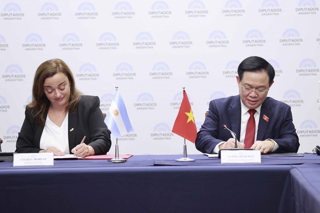 | Le président de l’Assemblée nationale du Vietnam, Vuong Dinh Huê, et la présidente de la Chambre des députés d’Argentine, Cecilia Moreau, signent l’accord de coopération entre les deux parlements. |
