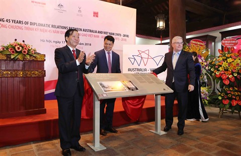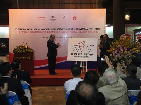Le Programme de célébration des 45 ans d’établissement des relations diplomatiques bilatérales a démarré par le dévoilement de son logo officiel ainsi que la remise par le gouvernement australien de neuf panneaux d’informations dédiés au Temple de la littérature. Le logo officiel est la combinaison entre deux symboles forts des deux pays : il s’agit de l’Opéra de Sydney et de l’étoile du drapeau national du Vietnam. Il a été sélectionné parmi quelques 150 dossiers de candidatures du concours de design lancé en novembre 2017 par l’ambassade australienne, l’École supérieure des arts appliqués de Hanoï en collaboration avec le ministère vietnamien des Affaires étrangères.