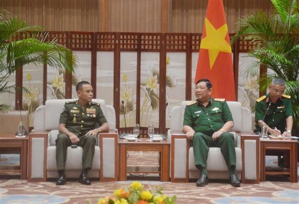 | Le chef adjoint de l'état-major général de l'Armée populaire du Vietnam, Huynh Chiên Thang (droite), et le directeur général du Centre d'études de stratégie militaire, relevant au Commandement général des forces armées royales cambodgiennes, Kim Vanna, le 13 août à Hanoï. |