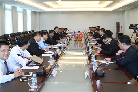 | La délégation vietnamienne travaille avec Mao Havannall, secrétaire d'État chargé de l'Aviation civile du Cambodge, le 29 novembre au Cambodge. |