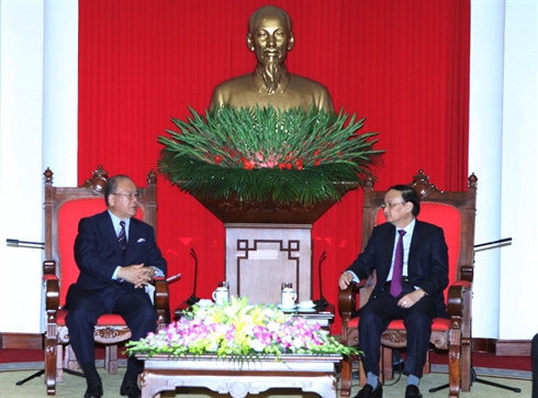 | Tô Huy Rua (droite), membre du politburo, chef de la Commission de l'organisation du CC du PCV, et l'ancien président de l'Union d'amitié des parlementaires Japon-Vietnam, Takebe Tsutomu, |