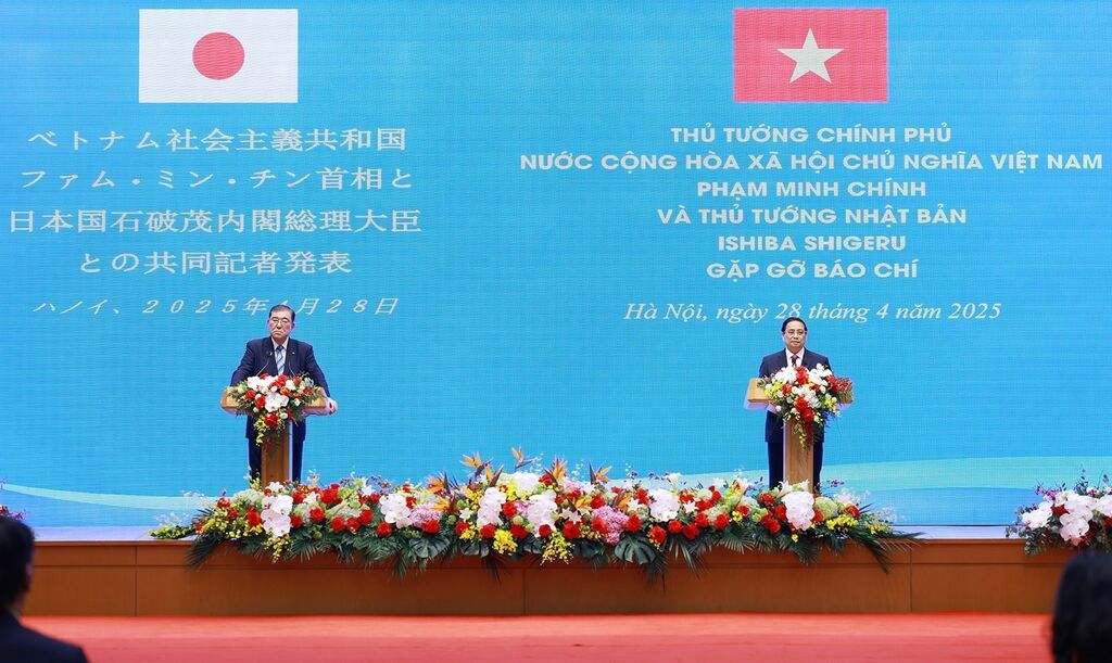 1. À l’occasion de la visite officielle du Premier ministre japonais Ishiba Shigeru en République socialiste du Vietnam, du 27 au 29 avril 2025, le Premier ministre japonais Ishiba Shigeru et le Premier ministre de la République socialiste du Vietnam, Pham Minh Chinh, ont eu un entretien de haut niveau à Hanoi, le 28 avril 2025.