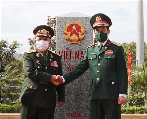 | Le général d’armée vietnamien Phan Van Giang (droite) et son homologue laotien Chansamone Chanyalath à la borne 605 de la porte-frontière de Lao Bao. |