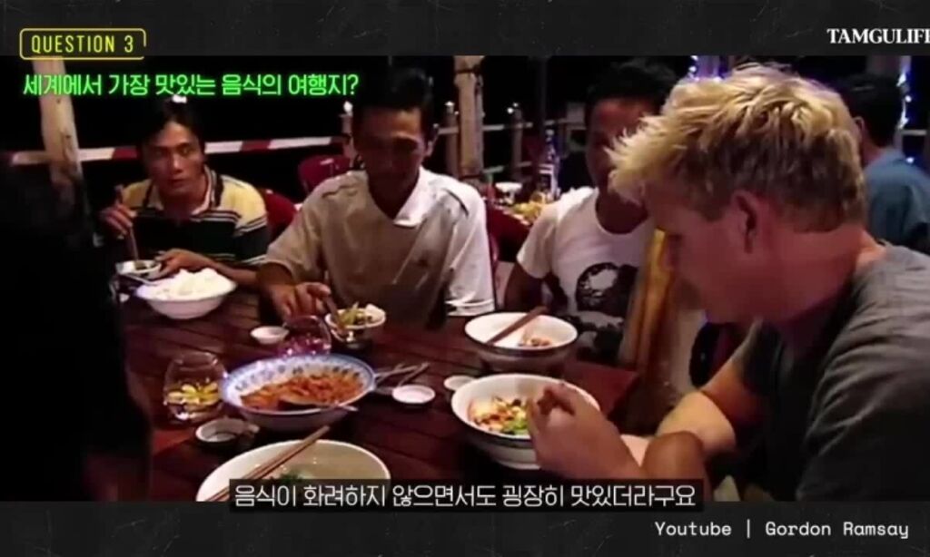 Dans une vidéo, Cho Seung-yeon a demandé à Gordon Ramsay : "Quelle est selon vous la destination culinaire numéro un ?". Il a rapidement donné comme réponse le Laos, le Vietnam et Madrid.
