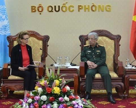 | Le vice-ministre de la Défense, Nguyên Chi Vinh, et la représentante résidente du PNUD au Vietnam, Caitin Wiesen, le 19 novembre à Hanoï. |
