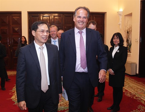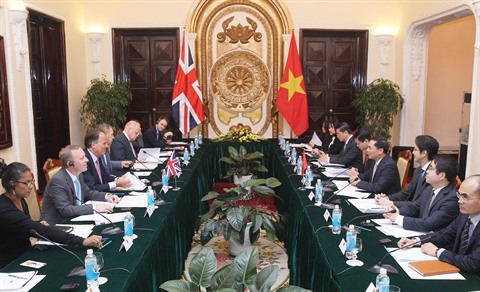 | Le vice-ministre vietnamien des AE, Bùi Thanh Son (gauche), et le ministre d’État pour l’Asie et le Pacifique de l’Office des AE et du Commonwealth du Royaume-Uni, Mark Field. |