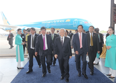 | Le secrétaire général du PCV, Nguyên Phu Trong (centre), participe à la cérémonie de réception d'un premier Boeing 787-9 Dreamliner de Vietnam Airlines, le 6 juillet à Washington. |