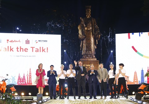 | Le Premier ministre néerlandais (centre) au défilé de mode "Walk the Talk", à l'esplanade du roi Ly Thai Tô, le 9 avril à Hanoï. |