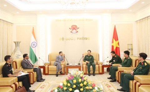 | Rencontre entre le général Phan Van Giang (droite), chef d'état-major général de l'Armée populaire du Vietnam et vice-ministre de la Défense, et l’ambassadeur d’Inde au Vietnam, Pranay Verma. |