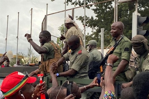 | Des militaires maliens sur la place de l’Indépendance à Bamako (Mali), lors d’un coup d’État militaire, le 18 août. |