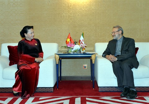 | La présidente de l'Assemblée nationale, Nguyên Thi Kim Ngân, a rencontré le président du Parlement iranien, Ali Ardeshir Larijani, le 8 avril à Doha. |