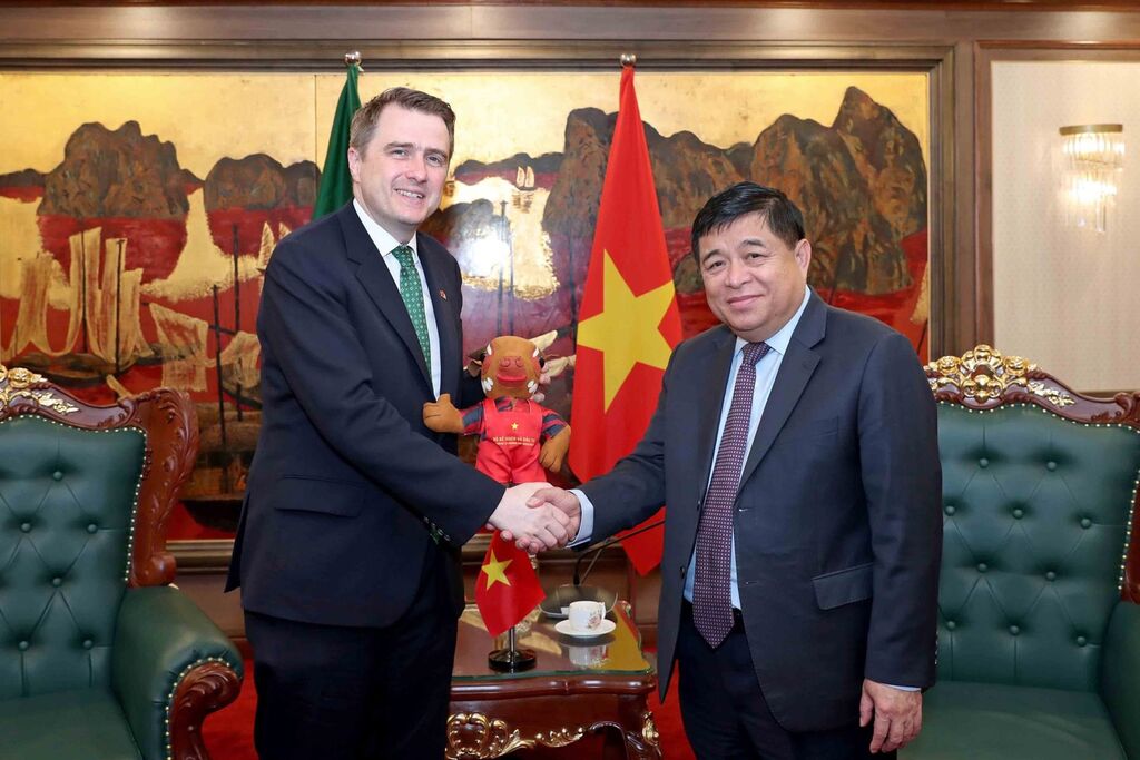 | Le ministre du Plan et de l’Investissement, Nguyên Chi Dung (droite) et le ministre d’État du ministère irlandais de la Justice, James Browne, à Hanoï. |
