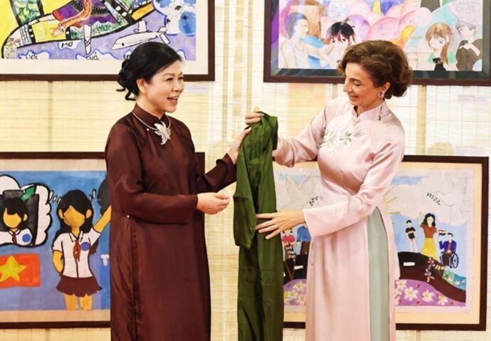 En reconnaissance de sa contribution à la promotion du patrimoine culturel vietnamien et au renforcement du partenariat stratégique entre le Vietnam et l’UNESCO, le vice-Premier ministre et ministre des Affaires étrangères Bùi Thanh Son a remis à la directrice générale de l’UNESCO, Audrey Azoulay, l’insigne "Pour la cause de la diplomatie vietnamienne".