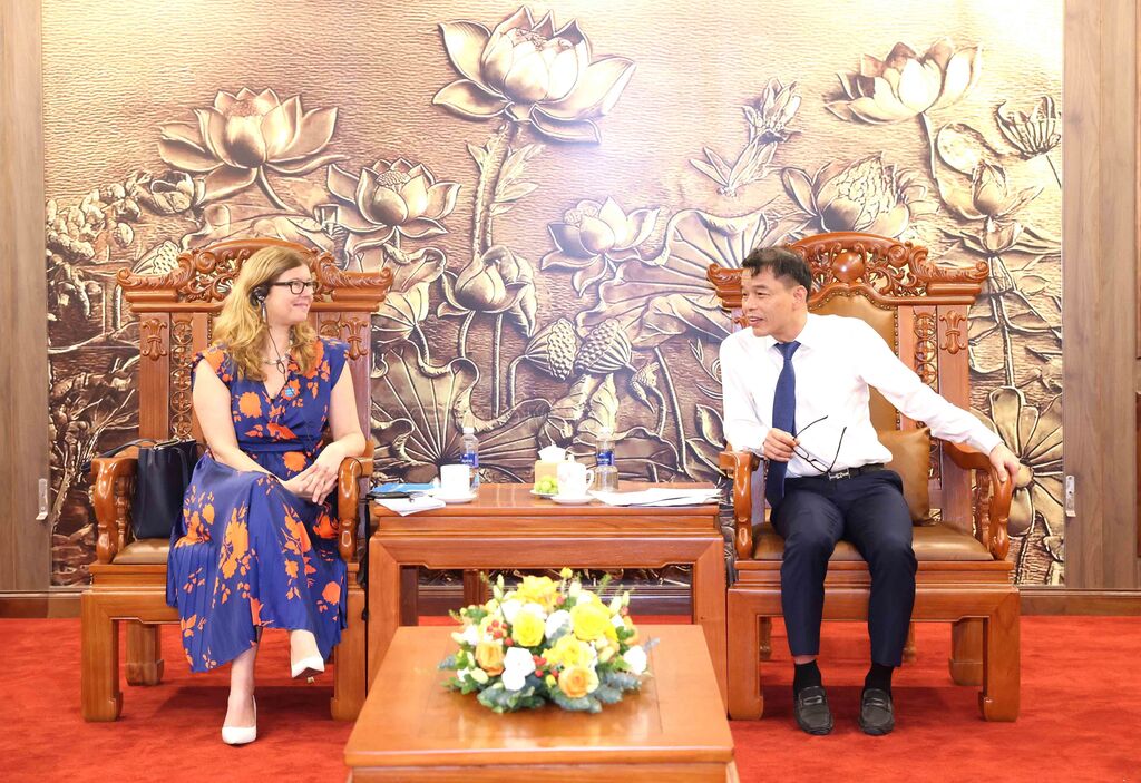 | Le vice-président de la Commission de la propagande, de l’éducation et de la sensibilisation auprès des masses du Comité central du Parti, Vu Thanh Mai (droite), et la représentante de l’UNICEF au Vietnam, Silvia Danailov. |