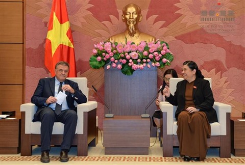 | La vice-présidente de l'Assemblée nationale, Tong Thi Phong, et le président du sous-comité des droits de l'homme de la Commission des relations extérieures du Parlement européen, Pier Antonio Panzeri. |