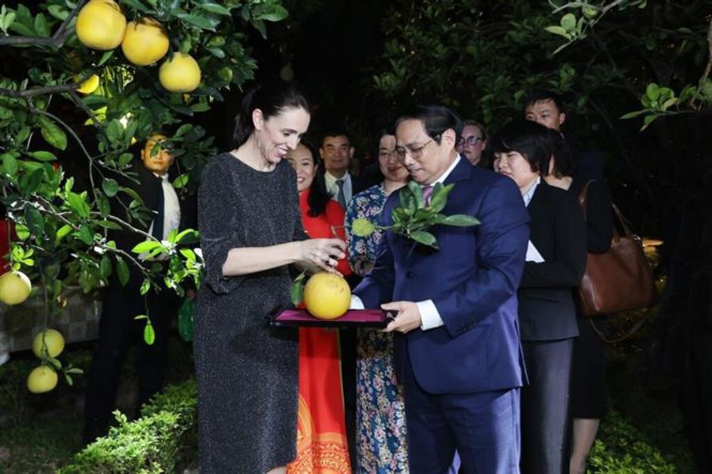 | La Première ministre néo-zélandaise, accompagnée de son homologue vietnamien Pham Minh Chinh, visite le verger de la zone des vestiges du Président Hô Chi Minh, au palais présidentiel. |